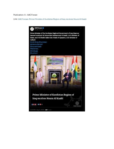 Publication: X – UAE Forsan Link: UAE Forsan: Prime Minister of Kurdistan Region of Iraq receives Noura Al Kaabi