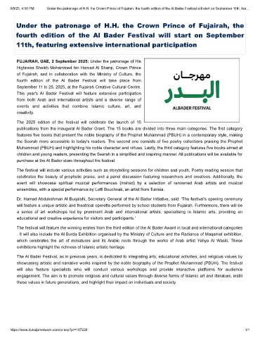 9/8/25, 4:50 PM Under the patronage of H.H. the Crown Prince of Fujairah, the fourth edition of the Al Bader Festival will start on September 11th, fea…