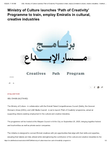 9/22/25, 11:59 AM UAE: Ministry of Culture launches ‘Path of Creativity’ Programme to train, employ Emiratis in cultural, creative industries - Aletihad …