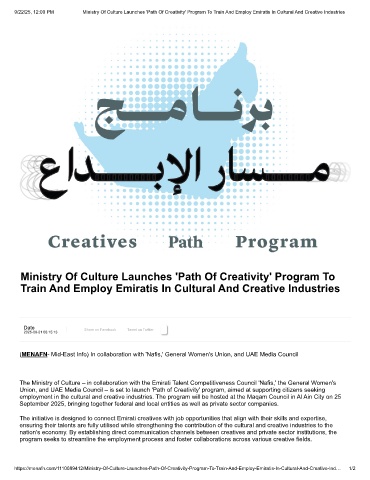 https://menafn.com/1110089412/Ministry-Of-Culture-Launches-Path-Of-Creativity-Program-To-Train-And-Employ-Emiratis-In-Cultural-And-Creative-Ind… 1/2