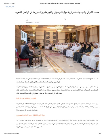 9/23/25, 1:31 PM بوﻌﺷﻟا لﺻاوﺗ ﻲﻓ ﺎھرود دّﻛؤﯾو ﺎھروطﺗو ﻰﻘﯾﺳوﻣﻟا لوﺣ ﺔﯾراوﺣ ﺔﺳﻠﺟ دﮭﺷﯾ ﻲﻗرﺷﻟا دﻣﺣﻣ