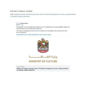 Publication: Facebook – Al Etihad Link: Al Etihad: Ministry of Culture launches ‘Path of Creativity’ Programme to train, employ Emiratis in cultural, creative industries
