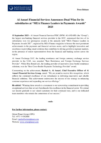 15 September 2025 – Al Ansari Financial Services PJSC (DFM: ALANSARI) (the “Group”),