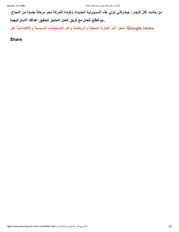 ،حﺎﺟﻧﻟا نﻣ ةدﯾدﺟ ﺔﻠﺣرﻣ وﺣﻧ ﺔﻛرﺷﻟا ةدﺎﯾﻗو ،ةدﯾدﺟﻟا ﺔﯾﻟوؤﺳﻣﻟا هذھ ﻲﻟوﺗ ﻲﻧﻓرﺷﯾ» :رﺎﺟﻧﻟا لﺎﻗ ،ﮫﺑﻧﺎﺟ نﻣ