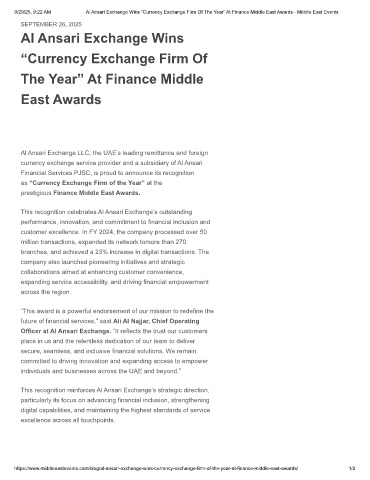9/29/25, 9:22 AM Al Ansari Exchange Wins “Currency Exchange Firm Of The Year” At Finance Middle East Awards - Middle East Events