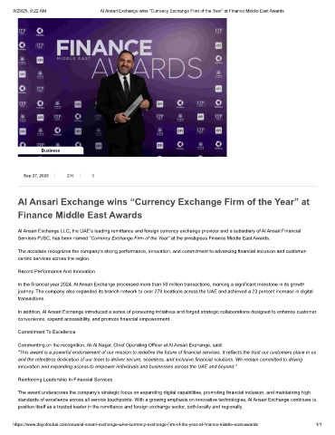 9/29/25, 9:22 AM Al Ansari Exchange wins “Currency Exchange Firm of the Year” at Finance Middle East Awards