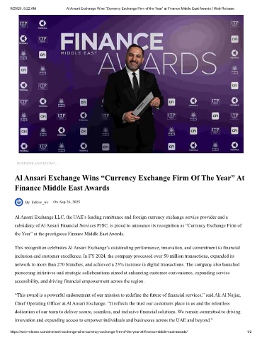 9/29/25, 9:22 AM Al Ansari Exchange Wins “Currency Exchange Firm of the Year” at Finance Middle East Awards | Web Release