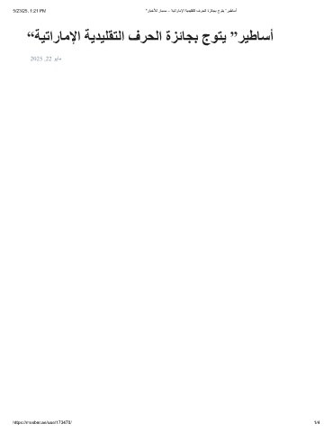 5/23/25, 1:21 PM “رﺎﺑﺧﻸﻟ رﺎﺑﺳﻣ – ﺔﯾﺗارﺎﻣﻹا ﺔﯾدﯾﻠﻘﺗﻟا فرﺣﻟا ةزﺋﺎﺟﺑ جوﺗﯾ ”رﯾطﺎﺳأ “ﺔﯿﺗارﺎﻣﻹا ﺔﯾﺪﯿﻠﻘﺘﻟا فﺮﺤﻟا ةﺰﺋﺎﺠﺑ جﻮﺘﯾ ”ﺮﯿطﺎﺳأ 2025 ,22 ﻮﯾﺎﻣ https://mesbar.ae/uae/173470/ 1/4