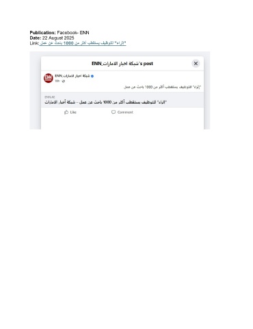 Publication: Facebook- ENN Date: 22 August 2025 Link: لمع نع ثحاب 1000 نم رثكأ بطقتسي فيظوتلل "ءارثإ"