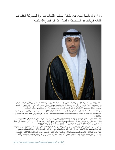 ةينطولا ةضايرلا ريوطت يف ةباشلا تاءافكلا ةكراشم زيزعتل ةدئار ةصنم لثمي يذلا ،بابشلا سلجم ليكشت نع ةضايرلا ةرازو تنلعأ