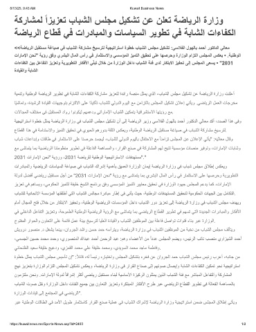 ﺔﯾﻣﻧﺗو ﺔﯾﻧطوﻟا ﺔﺿﺎﯾرﻟا رﯾوطﺗ ﻲﻓ ﺔﺑﺎﺷﻟا تاءﺎﻔﻛﻟا ﺔﻛرﺎﺷﻣ زﯾزﻌﺗﻟ ةدﺋار ﺔﺻﻧﻣ لﺛﻣﯾ يذﻟا ،بﺎﺑﺷﻟا سﻠﺟﻣ لﯾﻛﺷﺗ نﻋ ﺔﺿﺎﯾرﻟا ةرازو تﻧﻠﻋأ