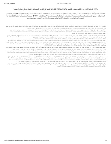 موﯾﻟا ﻊﻣ نﻣازﺗﻟﺎﺑ سﻠﺟﻣﻟا لﯾﻛﺷﺗ نﻼﻋإ ﻲﺗﺄﯾو .ﻲﺿﺎﯾرﻟا لﻣﻌﻟا تﺎﺟرﺧﻣ ﺔﯾﻣﻧﺗو ﺔﯾﻧطوﻟا ﺔﺿﺎﯾرﻟا رﯾوطﺗ ﻲﻓ ﺔﺑﺎﺷﻟا تاءﺎﻔﻛﻟا ﺔﻛرﺎﺷﻣ زﯾزﻌﺗﻟ ةدﺋار ﺔﺻﻧﻣ لﺛﻣﯾ يذﻟا ،بﺎﺑﺷﻟا سﻠﺟﻣ لﯾﻛﺷﺗ نﻋ ﺔﺿﺎﯾرﻟا ةرازو تﻧﻠﻋأ