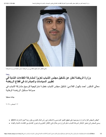 8/13/25, 9:39 AM ﺔﺿﺎﯾرﻟا عﺎطﻗ ﻲﻓ تاردﺎﺑﻣﻟاو تﺎﺳﺎﯾﺳﻟا رﯾوطﺗ ﻲﻓ ﺔﺑﺎﺷﻟا تاءﺎﻔﻛﻟا ﺔﻛرﺎﺷﻣﻟ ًازﯾزﻌﺗ بﺎﺑﺷﻟا سﻠﺟﻣ لﯾﻛﺷﺗ نﻋ نﻠﻌﺗ ﺔﺿﺎﯾرﻟا ةرازو