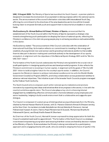 UAE, 12 August 2025- The Ministry of Sports has launched the Youth Council - a premier platform