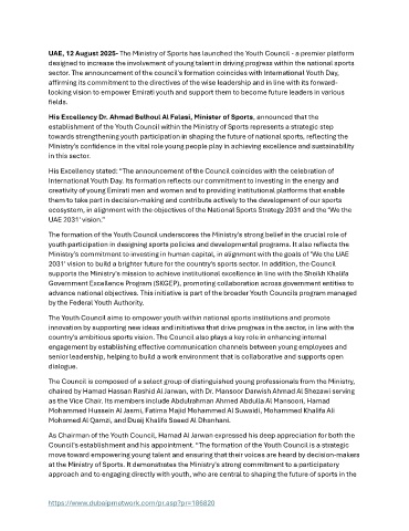 UAE, 12 August 2025- The Ministry of Sports has launched the Youth Council - a premier platform