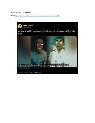Publication: X – Gulf Today Link: Gulf Today: Survivor of trafficking earns diploma in combating human trafficking in Dubai