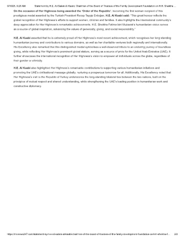 6/10/25, 9:26 AM Statement by H.E. Ali Salem Al Kaabi, Chairman of the Board of Trustees of the Family Development Foundation on H.H. Sheikha …