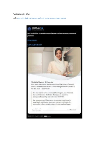 Publication: X - Wam Link: Wam: UAE’s Shaikha Al Nowais to run for UN Tourism Secretary-General position