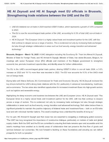 3/20/25, 1:20 PM HE Al Zeyoudi and HE Al Sayegh meet EU officials in Brussels, Strengthening trade relations between the UAE and the EU : GoDu…