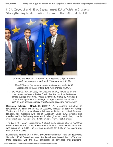 3/19/25, 12:52 PM Company News in Egypt: HE Al Zeyoudi and HE Al Sayegh meet EU officials in Brussels, Strengthening trade relations between t…