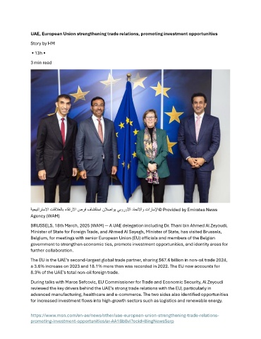 BRUSSELS, 18th March, 2025 (WAM) -- A UAE delegation including Dr. Thani bin Ahmed Al Zeyoudi,