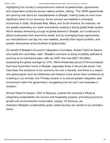On behalf of Sharjah’s Economic Integration Committee, Sheikh Fahim Al Qasimi,