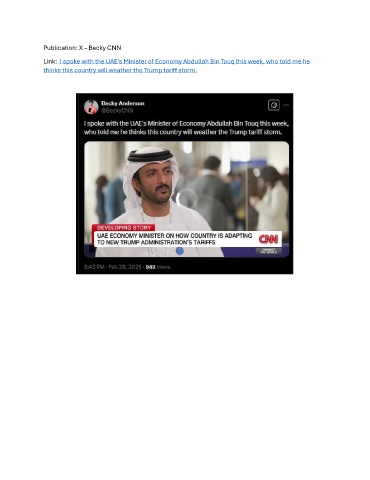 Publication: X – Becky CNN Link: I spoke with the UAE's Minister of Economy Abdullah Bin Touq this week, who told me he thinks this country will weather the Trump tariff storm.