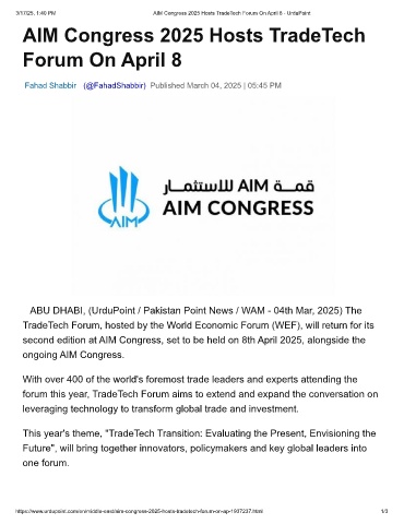 3/17/25, 1:40 PM AIM Congress 2025 Hosts TradeTech Forum On April 8 - UrduPoint