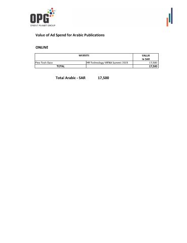 Value of Ad Spend for Arabic Publications ONLINE WEBSITE VALUE In SAR Fine Tech Gate HR Technology MENA Summit 2025 17,500 TOTAL 17,500 Total Arabic - SAR 17,500