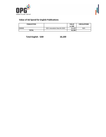 Value of Ad Spend for English Publications PUBLICATION VALUE CIRCULATIONS In SAR CBNME KSA Innovation Awards 2025 16,100 N/A TOTAL 16,100 Total English - SAR 16,100