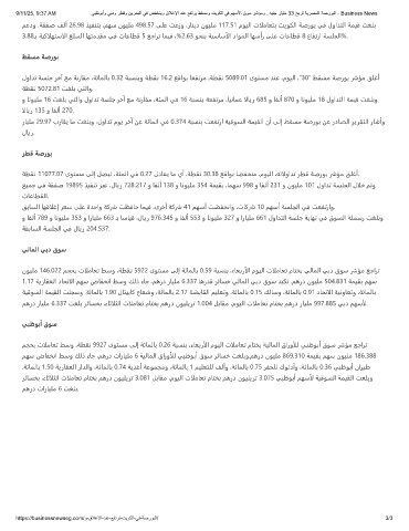 نﻮﻴﻠﻣ 146.022 ﻢﺠﺤﺑ تالﻣﺎﻌﺗ ﻂﺳو ،ﺔﻄﻘﻧ 5922 ىﻮﺘﺴﻣ ﻰﻟإ ﺔﺋﺎﻤﻟﺎﺑ 0.59 ﺔﺒﺴﻨﺑ ،ءﺎﻌﺑرألا مﻮﻴﻟا تالﻣﺎﻌﺗ مﺎﺘﺨﺑ ﻲﻟﺎﻤﻟا ﻲﺑد قﻮﺳ رشﺆﻣ ﻊﺟاﺮﺗ