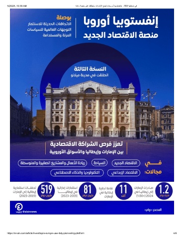 5/26/25, 10:30 AM ةدﺋار ﺔﺻﻧﻣ ﻰﻠﻋ ﺎﯾﻟﺎطﯾإو تارﺎﻣﻹا ﻊﻣﺟﺗ «ﺎﺑوروأ ﺎﯾﺑوﺗﺳﻔﻧإ» ..ﺔﺛﻟﺎﺛﻟا ﺎﮭﺗﺧﺳﻧ ﻲﻓ https://al-ain.com/article/investtopia-europe-uae-italy-pioneering-platform 4/6