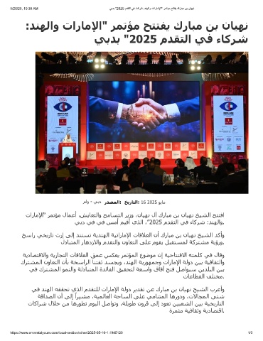 5/26/25, 10:38 AM ﻲﺑدﺑ "2025 مدﻘﺗﻟا ﻲﻓ ءﺎﻛرﺷ :دﻧﮭﻟاو تارﺎﻣﻹا" رﻣﺗؤﻣ ﺢﺗﺗﻔﯾ كرﺎﺑﻣ نﺑ نﺎﯾﮭﻧ