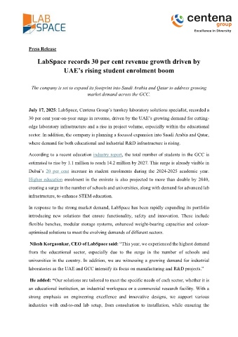 July 17, 2025: LabSpace, Centena Group’s turnkey laboratory solutions specialist, recorded a