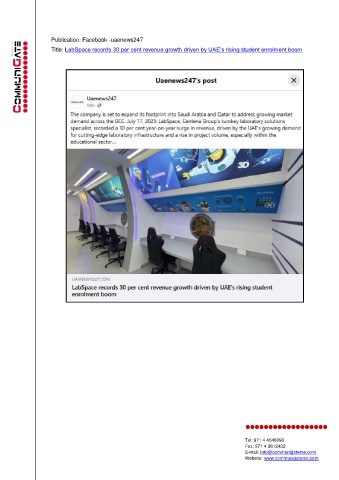 Publication: Facebook -uaenews247 Title: LabSpace records 30 per cent revenue growth driven by UAE’s rising student enrolment boom Tel: 971 4 4546093 Fax: 971 4 3612432 E-mail: info@communigateme.com Website: www.communigateme.com