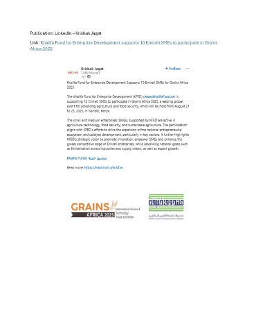Publication: LinkedIn – Krishak Jagat Link: Khalifa Fund for Enterprise Development supports 10 Emirati SMEs to participate in Grains Africa 2025