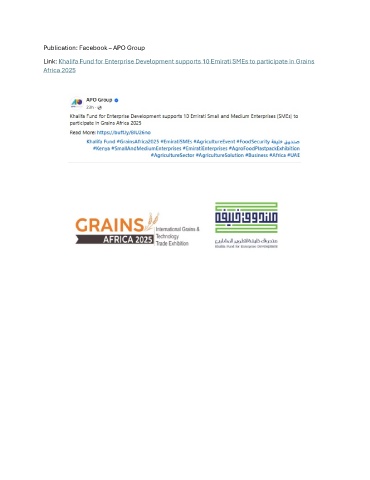Publication: Facebook – APO Group Link: Khalifa Fund for Enterprise Development supports 10 Emirati SMEs to participate in Grains Africa 2025