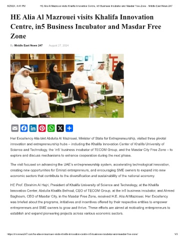 8/29/24, 4:41 PM HE Alia Al Mazrouei visits Khalifa Innovation Centre, in5 Business Incubator and Masdar Free Zone - Middle East News 247