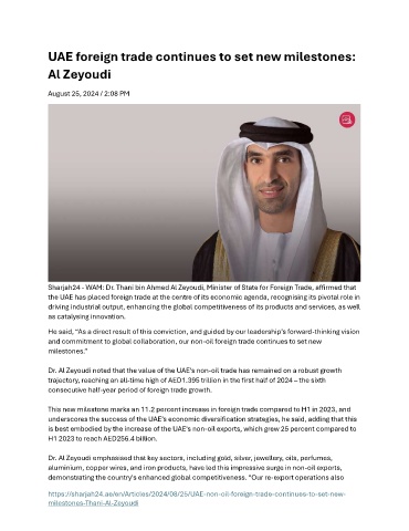 Sharjah24 - WAM: Dr. Thani bin Ahmed Al Zeyoudi, Minister of State for Foreign Trade, affirmed that