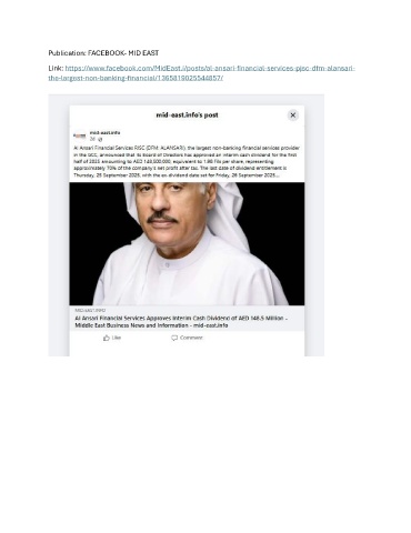 Publication: FACEBOOK- MID EAST Link: https://www.facebook.com/MidEast.i/posts/al-ansari-financial-services-pjsc-dfm-alansari- the-largest-non-banking-financial/1365819025544857/