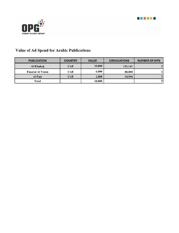 Value of Ad Spend for Arabic Publications PUBLICATION COUNTRY VALUE CIRCULATIONS NUMBER OF HITS Al Khaleej UAE 10,800 121,141 3 Emarat Al Youm UAE 6,000 80,000 3 Al Fajr UAE 2,000 34,596 1 Total 18,800 7
