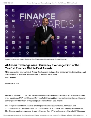9/26/25, 9:23 AM Al Ansari Exchange wins “Currency Exchange Firm of the Year” at Finance Middle East Awards