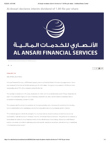 9/22/25, 9:09 AM Al Ansari declares interim dividend of 1.98 fils per share - Aletihad News Center