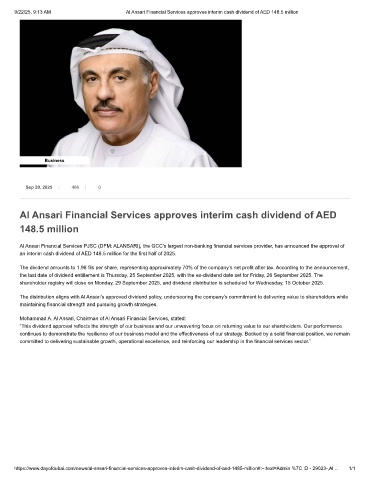 9/22/25, 9:13 AM Al Ansari Financial Services approves interim cash dividend of AED 148.5 million