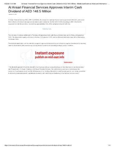 9/22/25, 9:13 AM Al Ansari Financial Services Approves Interim Cash Dividend of AED 148.5 Million - Middle East Business News and Information - …