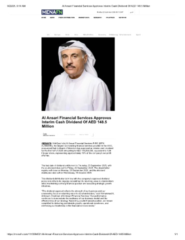 9/22/25, 9:14 AM Al Ansari Financial Services Approves Interim Cash Dividend Of AED 148.5 Million