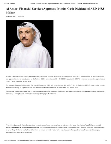 9/22/25, 9:14 AM Al Ansari Financial Services Approves Interim Cash Dividend of AED 148.5 Million - Middle East News 247