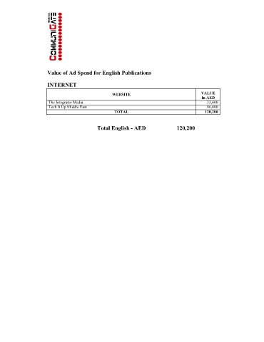 Value of Ad Spend for English Publications INTERNET WEBSITE VALUE In AED The Integrator Media 33,600 Tech It Up Middle East 86,600 TOTAL 120,200 Total English - AED 120,200