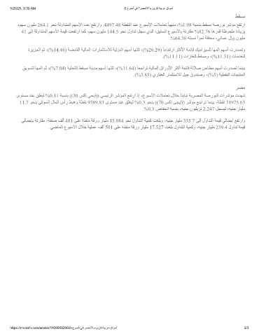 ،ﻢﮭﺳ نﻮﯿﻠﻣ 264.1 ﻮﺤﻧ ﺔﻟواﺪﺘﻤﻟا ﻢﮭﺳﻷا دﺪﻋ ﻊﻔﺗراو .4497.48 ﺔﻄﻘﻨﻟا ﺪﻨﻋ عﻮﺒﺳﻷا تﻼﻣﺎﻌﺗ ً ﺎﯿﮭﻨﻣ ،%1.98 ﺔﺒﺴﻨﺑ ﻂﻘﺴﻣ ﺔﺻرﻮﺑ ﺮﺷﺆﻣ ﻊﻔﺗرا