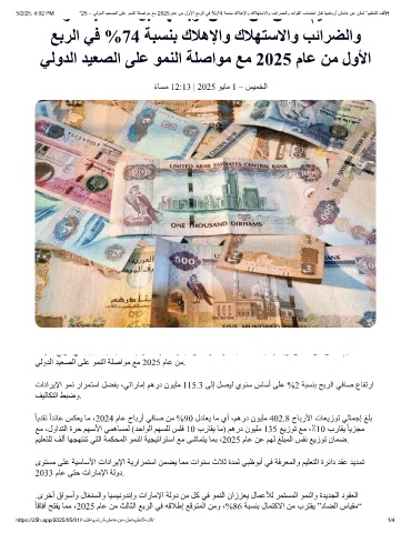 5/2/25, 4:02 PM “25 – ﻲﻟودﻟا دﯾﻌﺻﻟا ﻰﻠﻋ وﻣﻧﻟا ﺔﻠﺻاوﻣ ﻊﻣ 2025 مﺎﻋ نﻣ لوﻷا ﻊﺑرﻟا ﻲﻓ %74 ﺔﺑﺳﻧﺑ كﻼھﻹاو كﻼﮭﺗﺳﻻاو بﺋارﺿﻟاو دﺋاوﻔﻟا بﺎﺳﺗﺣا لﺑﻗ ﺎﮭﺣﺎﺑرأ شﻣﺎھ نﻋ نﻠﻌﺗ ”مﯾﻠﻌﺗﻠﻟ فﻟأH